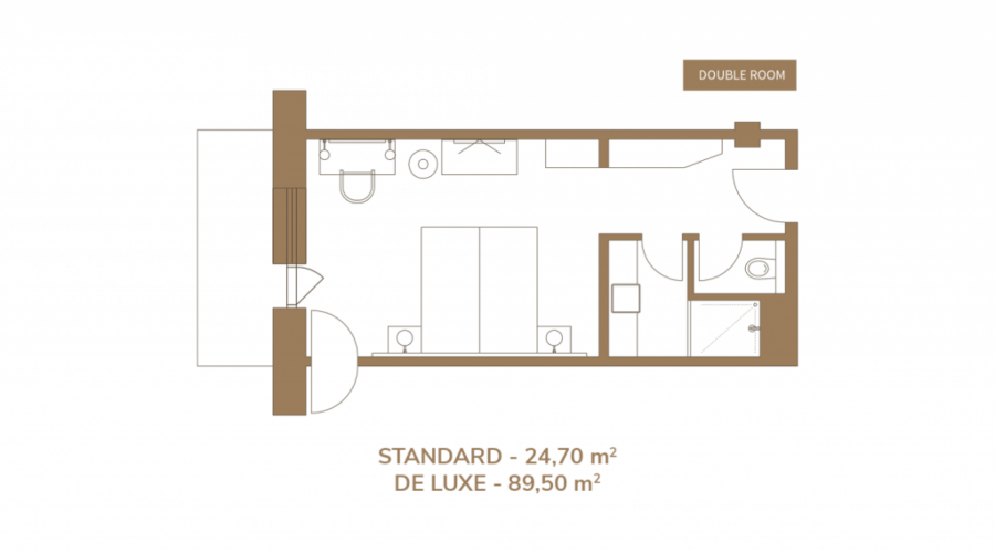 Dvojlôžková izba DOUBLE ROOM DE LUXE ponúka komfortné ubytovanie pre dvoch ľudí. Izby DE LUXE DOUBLE ROOM sa nachádzajú na 5. a 6. poschodí hotela a ich súčasťou je priestranný šatník.