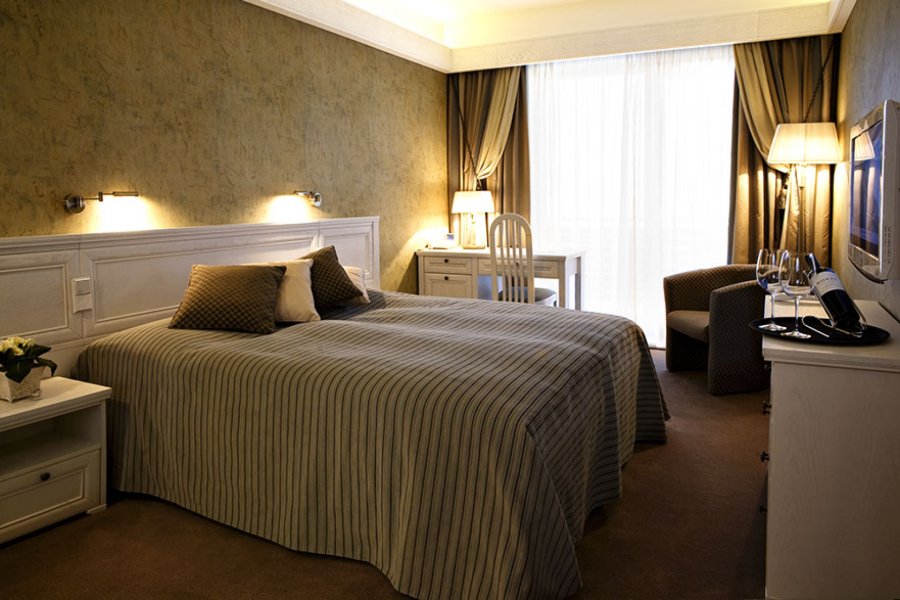 manželská posteľ (možnosť oddeliť lôžka), kúpeľna s vaňou, LCD televízor, internet, telefón, trezor, minibar, balkón