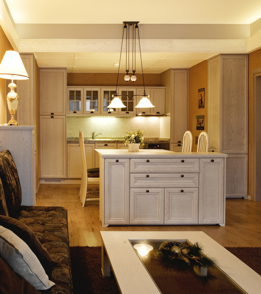 plne vybavená kuchynská linka (indukčná rúra s platňou, mikrovlnka, chladnička, práčka, umývačka riadu a varná kanvica)